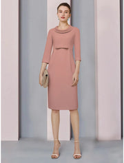 A-Line Mother of the Bride Dress Wedding Guest Elegant Petite Jewel Neck Knee Length Satin 3/4 Length Sleeve with Bow(s) Ruching Solid Color