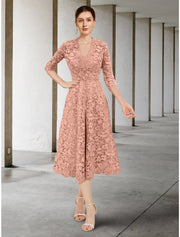 A-Line Mother of the Bride Dress Wedding Guest Elegant Petite V Neck Tea Length Chiffon 3/4 Length Sleeve with Ruching Solid Color