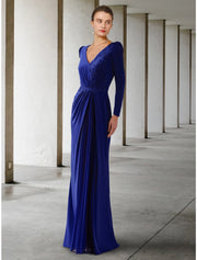 A-Line Mother of the Bride Dress Wedding Guest Elegant V Neck Floor Length Lace Stretch Chiffon Long Sleeve with Ruching Solid Color