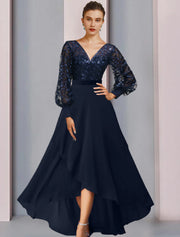 A-Line Mother of the Bride Dress Wedding Guest Sparkle & Shine High Low Jewel Neck Asymmetrical Tea Length Chiffon Lace Sequined Long Sleeve with Sequin Appliques Fall