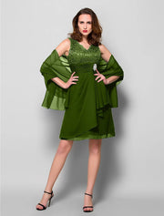 A-Line Mother of the Bride Dress Wrap Included V Neck Knee Length Chiffon Lace Bodice Sleeveless with Lace Ruched Crystal Brooch