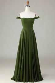 A-Line Off The Shoulder Olive Long Bridesmaid Dress with Slit