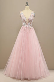 A Line Pink Low V Neck Prom Dress with Appliques Beautiful