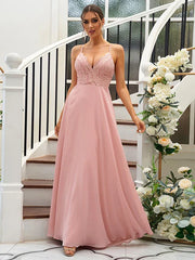 A-Line/Princess Chiffon Lace V-neck Sleeveless Floor-Length Bridesmaid Dresses Party Dresses Wedding Guest Dresses - Pink