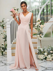 A-Line/Princess Chiffon Ruched V-neck Sleeveless Sweep/Brush Train Bridesmaid Dresses Party Dresses Wedding Guest Dresses