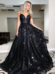A-Line/Princess Floor-Length V-neck Sequin Sleeveless Sequins Dresses