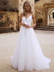 A-Line/Princess Lace Applique V-neck Sleeveless Sweep/Brush Train Wedding Dresses