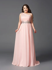 A-Line/Princess One-Shoulder Rhinestone Sleeveless Long Chiffon Plus Size Dresses