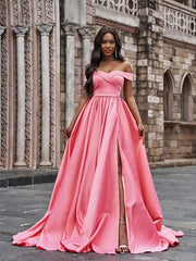 A-Line Princess Satin Sleeveless Ruffles Off-the-Shoulder Court Train Dresses