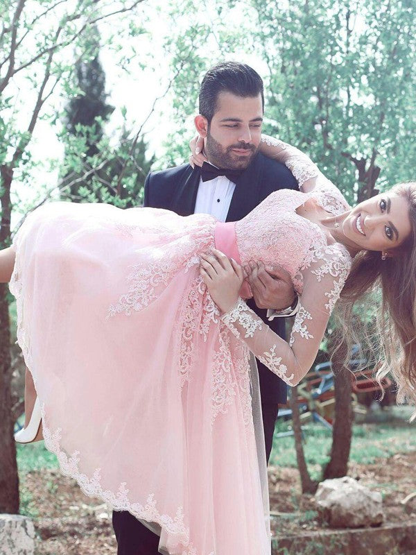 A-Line/Princess Sleeveless Sweetheart Lace Tulle Cathedral Train Dresses