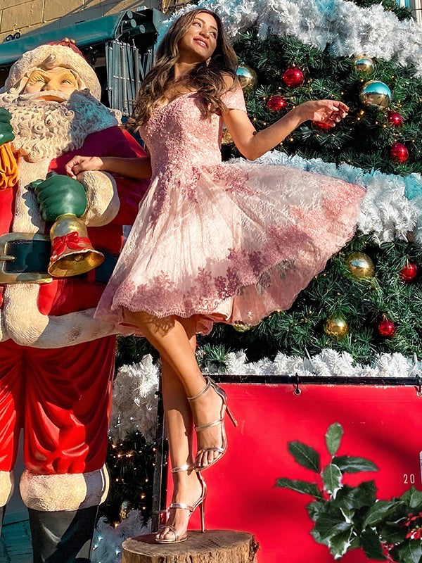 A-Line/Princess Tulle Applique Off-the-Shoulder Sleeveless Short/Mini Dresses