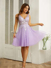 A-Line/Princess Tulle Beading V-neck Sleeveless Knee-Length Dresses