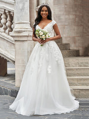 A-Line/Princess Tulle V-neck Applique Sleeveless Sweep/Brush Train Wedding Dresses