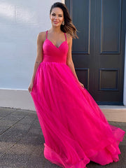 A-Line/Princess Tulle V-neck Ruched Sleeveless Sweep/Brush Train Party Dresses Formal Dresses - Fuchsia