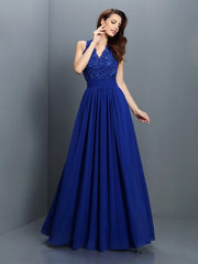 A-Line/Princess V-neck Applique Sleeveless Long Chiffon Bridesmaid Dresses