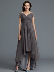 A-Line V-neck Short Sleeves Asymmetrical Tulle Mother of the Bride Dresses