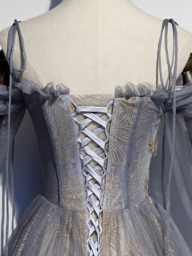 A-Line Prom Dresses Glittering Dress Wedding Guest Floor Length 3/4 Length Sleeve Spaghetti Strap Tulle with Sequin Embroidery - US 2 / UK 6 / EU 32
