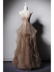 A-Line Prom Dresses Sexy Dress Formal Floor Length Sleeveless Spaghetti Strap Lace with Ruffles Appliques