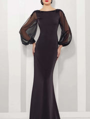 A Line Sheath Mermaid Jewel Neck Floor Length Wedding Guest Party Dress Satin Tulle Long Sleeve Mother of the Bride Dress with Appliques - US 2 / UK 6 / EU 32