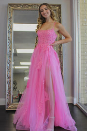 A-Line Spaghetti Straps Pink Lace Backless Formal Evening Dresses Long Prom Dresses With Appliques