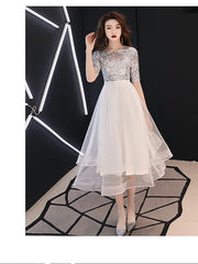 A-Line Sparkle White Cocktail Party Prom Dress Jewel Neck Half Sleeve Tea Length Satin with Sequin Tier - Show As picture