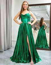 A-Line Sparkly Dark Green Spaghetti Straps Pleated Prom Dress With Slit