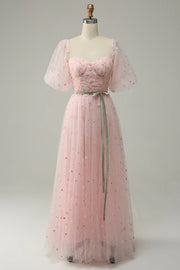 A Line Sweetheart Blush Long Prom Dress with Flora Embroidery