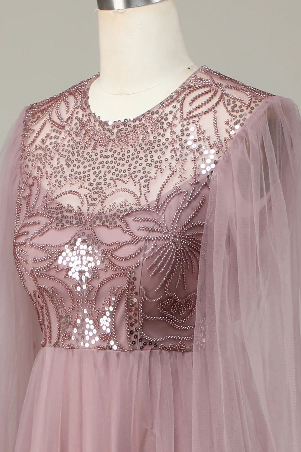 A Line Tulle Blue Sequin Long Sleeves Bridesmaid Dress