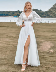 A-Line  V Neck Long Sleeves Tulle Beading Ivory Wedding Dress