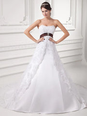 A-Line Wedding Dresses Strapless Chapel Train Lace Satin Tulle Strapless with Sashes Ribbons Bow(s) Beading