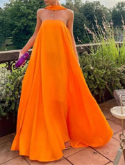 A-Line Wedding Guest Dress Floor Length Sleeveless Strapless Stretch Chiffon with Pleats Shawl - Orange