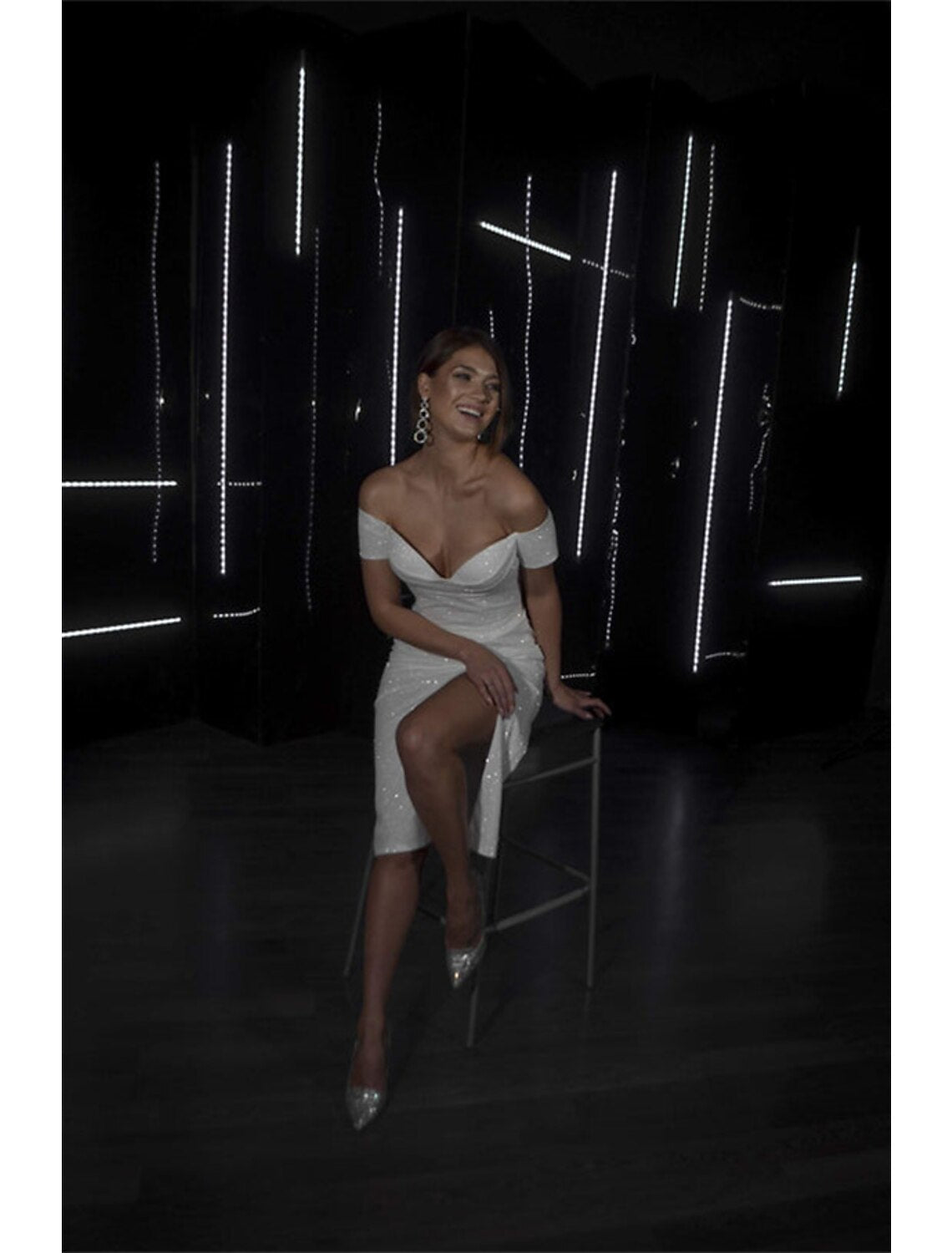 Bachelorette Party Sparkle & Shine Little White Dresses Wedding Dresses Sheath / Column Off Shoulder Cap Sleeve Tea Length Sequined Bridal Gowns With Ruched Split Front - White / US 2 / UK 6 / EU 32