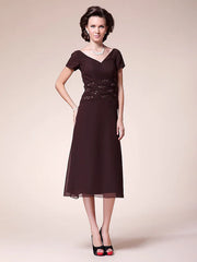 Ball Gown Cocktail Party Wedding Party Dress V Neck Short Sleeve Tea Length Chiffon with Ruched Beading
