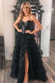 Black Sweetheart Tiered Long Prom Dresses with Slit A Line Strapless Evening Dress