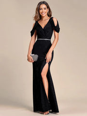 Cold Shoulder Puff Sleeve V-neck Shiny Belt Backless Glitter Evening Dress/Prom Dresses Party Dresses Wedding Guest Dresses - Black