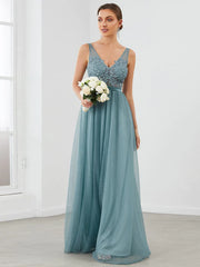 Custom Size A-Line V-Neck Floral Lace Appliques Bridesmaid Dress - Dusty Blue