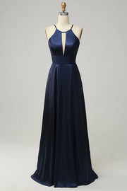 Navy Blue Hanging Neck Satin Open Back Long Bridesmaid Dress