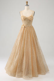 Glitter Golden Corset Long Prom Dress with Flowers Sparkly
