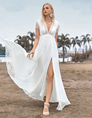 Low V-neck Short Sleeve Simple Boho Wedding Dress with Slit