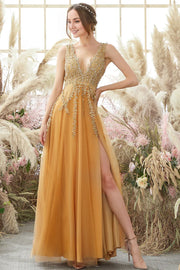 Low V-neck Tulle Long Prom Dress with Appliques