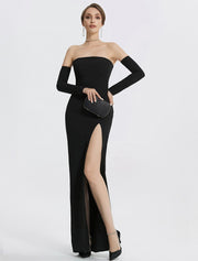 Mermaid Evening Gown Black Dress With Gloves Formal Wedding Guest Floor Length Long Sleeve Strapless Stretch Fabric with Slit