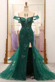Mermaid Off The Shoulder Dark Green Prom Dress With Appliques Beautiful With Slit