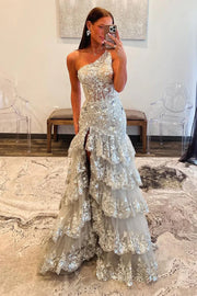 Mermaid One Shoulder Lace Sequins Layers Long Prom Dress with Slit Sexy