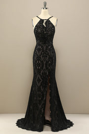Mermaid Spaghetti Straps Lace Long Prom Dress With Split - Black