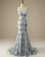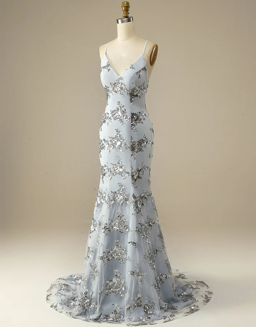 Mermaid Spaghetti Straps V Neck Glitter Silver Long Prom Dress