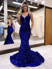 Mermaid / Trumpet Evening Gown Sparkle & Shine Dress Formal Court Train Sleeveless V Neck Sequined Backless with Sequin
