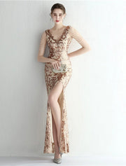 Mermaid / Trumpet Evening Gown Sparkle & Shine Dress Formal Floor Length Short Sleeve V Neck Sequined with Sequin Slit