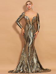 Mermaid / Trumpet Evening Gown Vintage Dress Prom Sweep / Brush Train Long Sleeve V Neck Sequined with Sequin - US 2 / UK 6 / EU 32