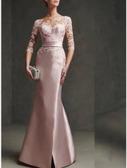 Mermaid / Trumpet Mother of the Bride Dress Formal Elegant Party Scoop Neck Floor Length Satin Lace 3/4 Length Sleeve with Pleats Split Front