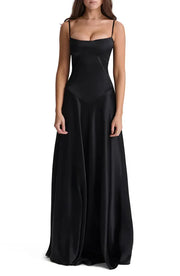 Noble black backless lace up satin thin shoulder strap and floor length evening dress Solid Color